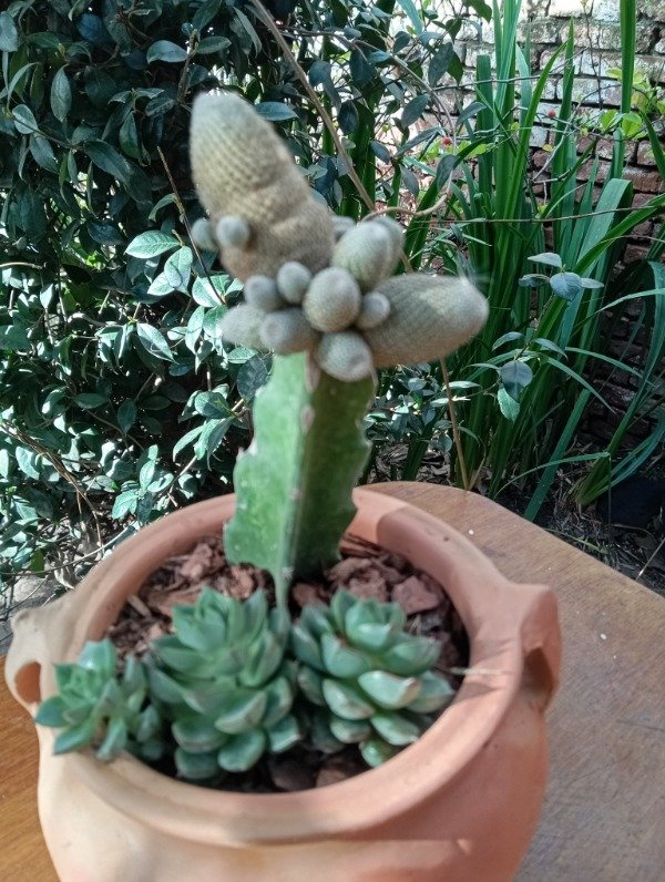 Maceta rústica de barro con cactus y suculentas variadas, combinando texturas y tonalidades verdes que aportan un estilo natural y decorativo.