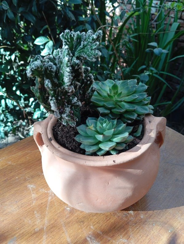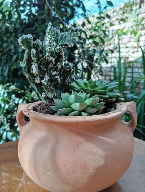 Maceta rústica de barro con cactus y suculentas variadas, combinando texturas y tonalidades verdes que aportan un estilo natural y decorativo.