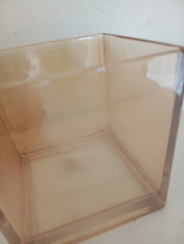 Florero cuadrado de vidrio color ámbar, de diseño simple y moderno, ideal para arreglos florales o decoración minimalista.