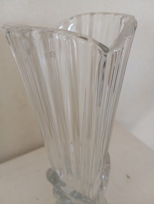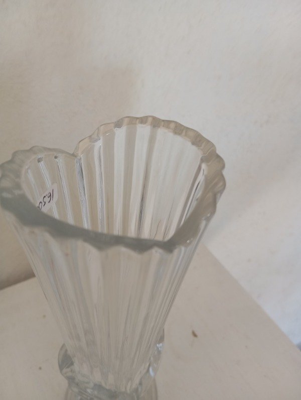 Florero de vidrio transparente con diseño estriado y forma elegante, ideal para realzar arreglos florales.