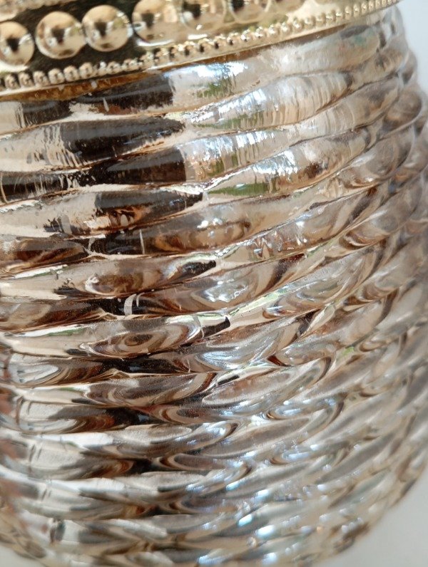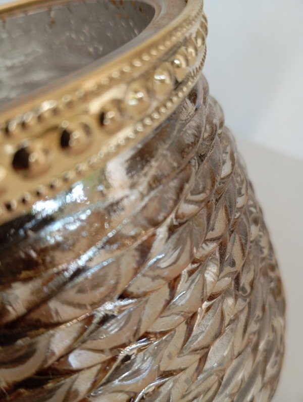 Porta vela de vidrio en tono dorado con relieve texturizado y borde decorado, de estilo elegante y sofisticado.