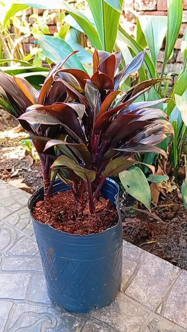 Planta de follaje decorativo con hojas alargadas y brillantes de tonos rojizos y verdes, ideal para interiores luminosos o jardines de semisombra.