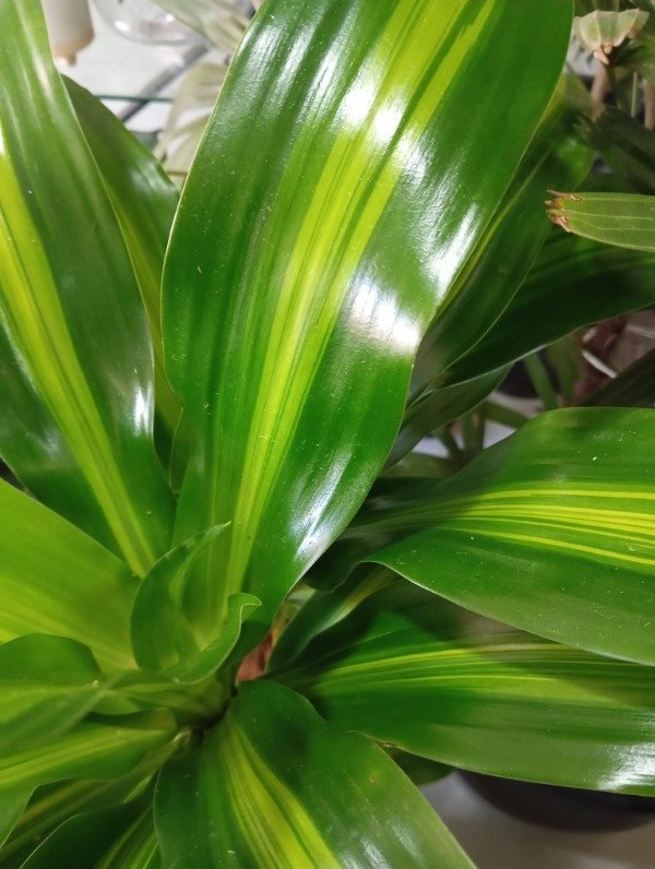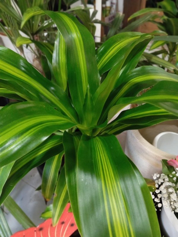 Planta Dracaena massangeana o tronco de Brasil, de hojas largas verdes con franjas amarillas, muy resistente y decorativa para interiores.