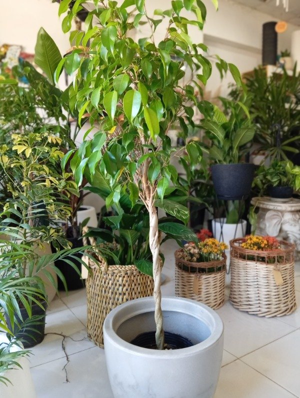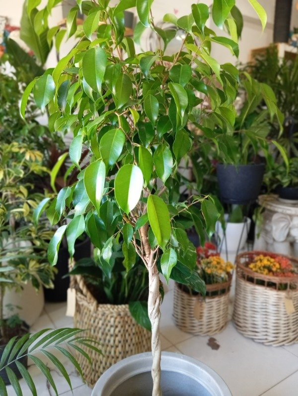 Apariencia: Tallo trenzado (varios troncos entrelazados); hojas verdes brillantes y colgantes.