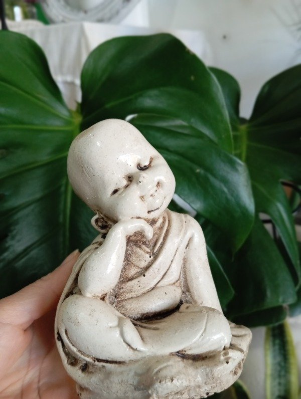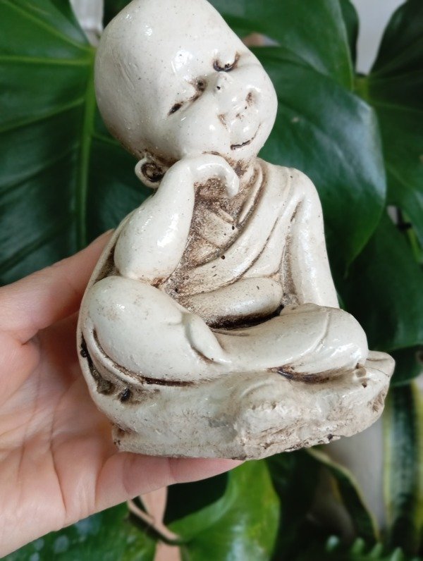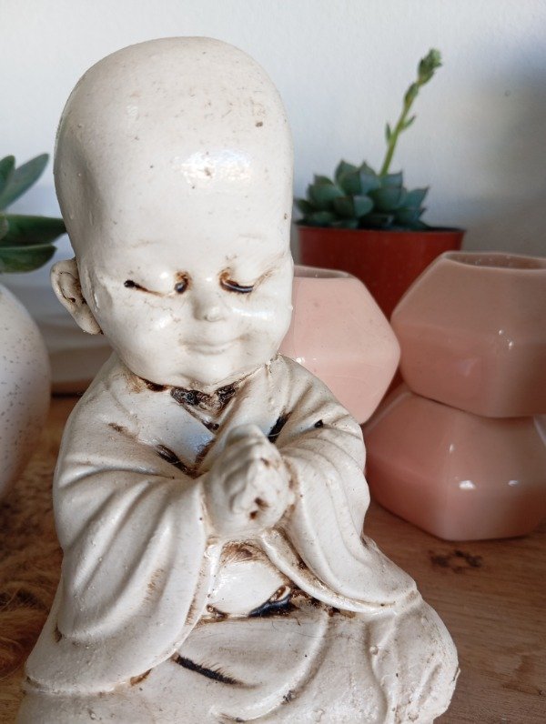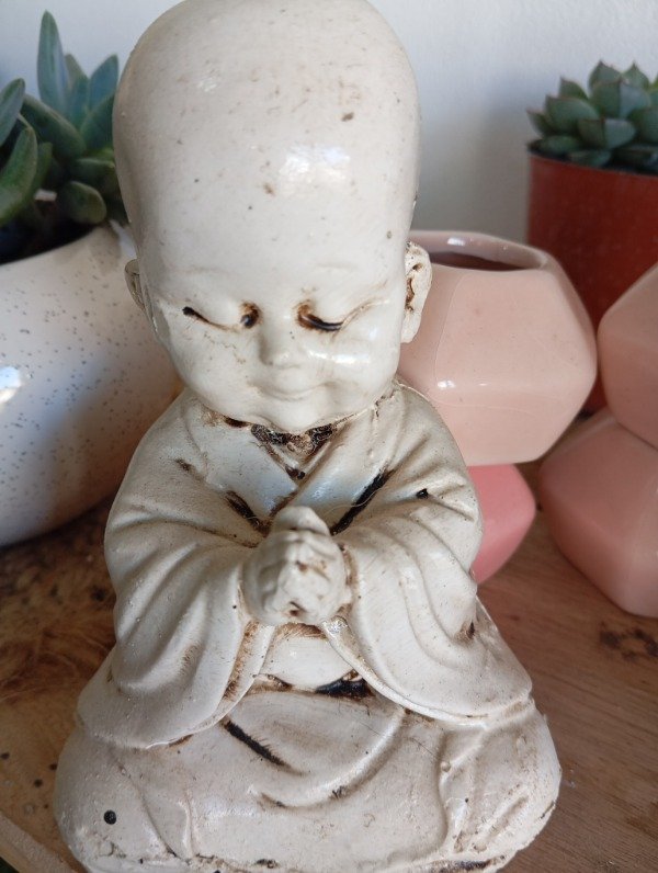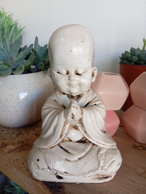 Figura decorativa de monje budista infantil en actitud de oración, con acabado beige envejecido que transmite serenidad y ternura.