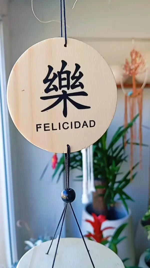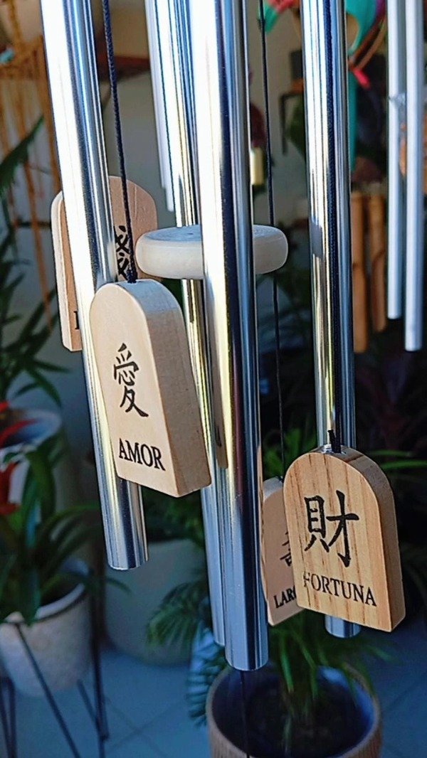 Móvil de viento decorativo con tubos metálicos y detalles en madera grabados con símbolos y palabras de buena energía como "Felicidad" y "Fortuna". Ideal para ambientar y armonizar espacios.
