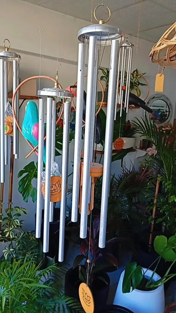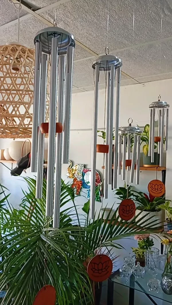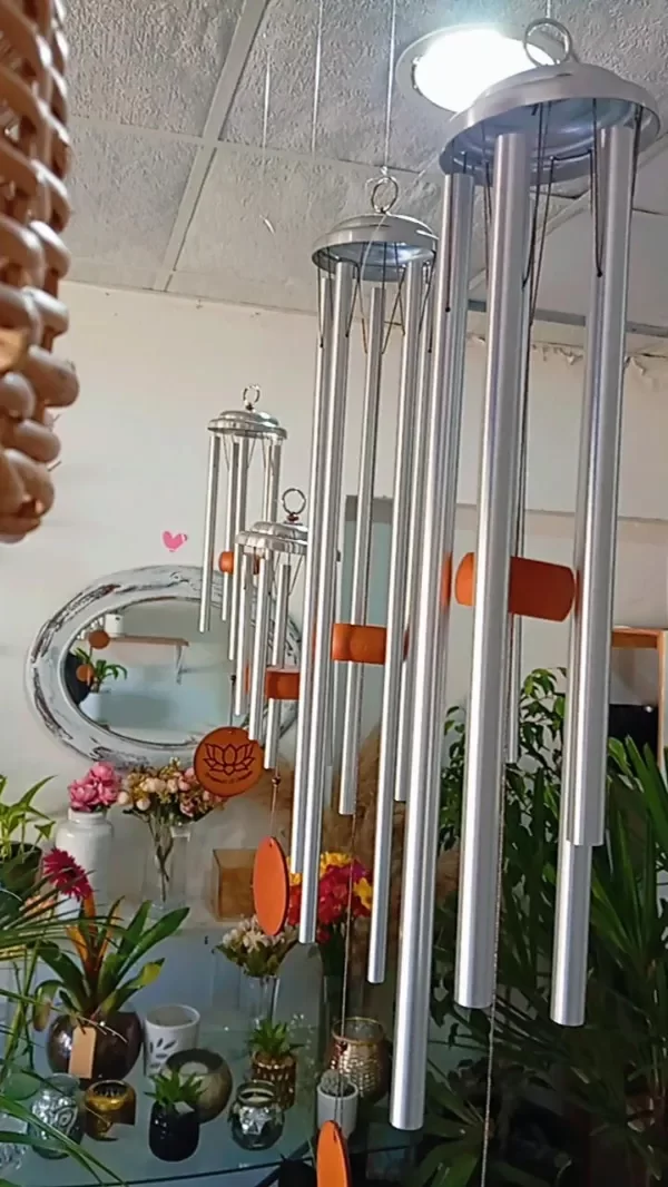 Llamadores de viento metálicos con tubos de aluminio en distintos tamaños, que producen un sonido armonioso al moverse. Cuentan con piezas decorativas en madera color naranja y diseños grabados, ideales para ambientar espacios con un toque relajante y estético. Perfectos para interior o exterior.