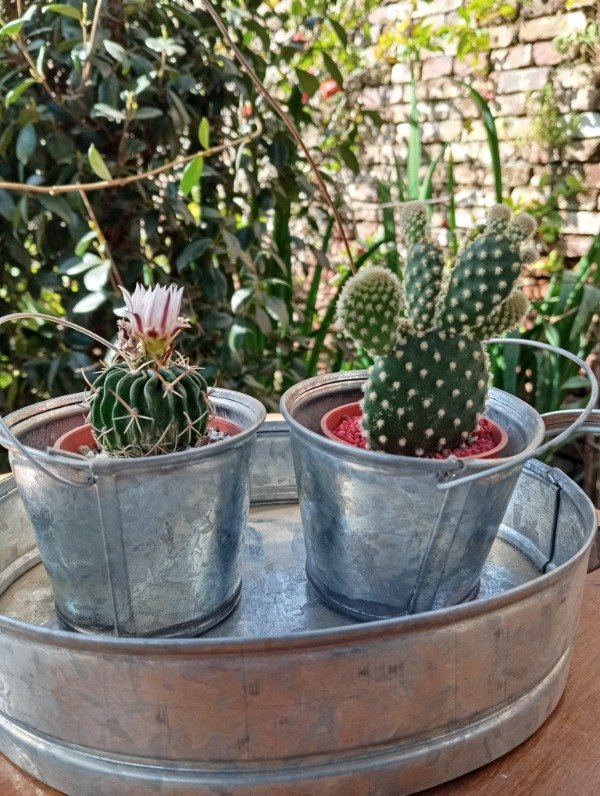 Set de dos mini baldes de metal con bandeja a juego, de estilo rústico y decorativo.
