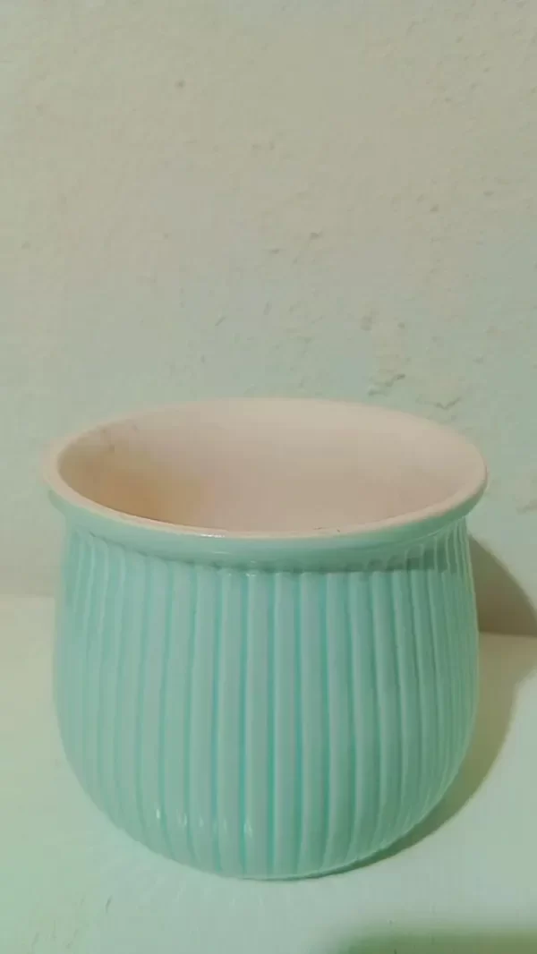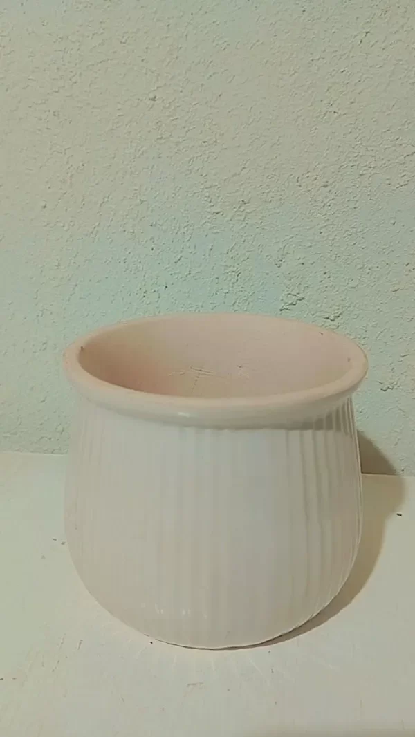 Maceta de cerámica con un diseño cilíndrico ligeramente abombado en la parte inferior y boca ancha en la parte superior. Su superficie presenta un acabado con líneas verticales en relieve, lo que le da un estilo elegante y sencillo.