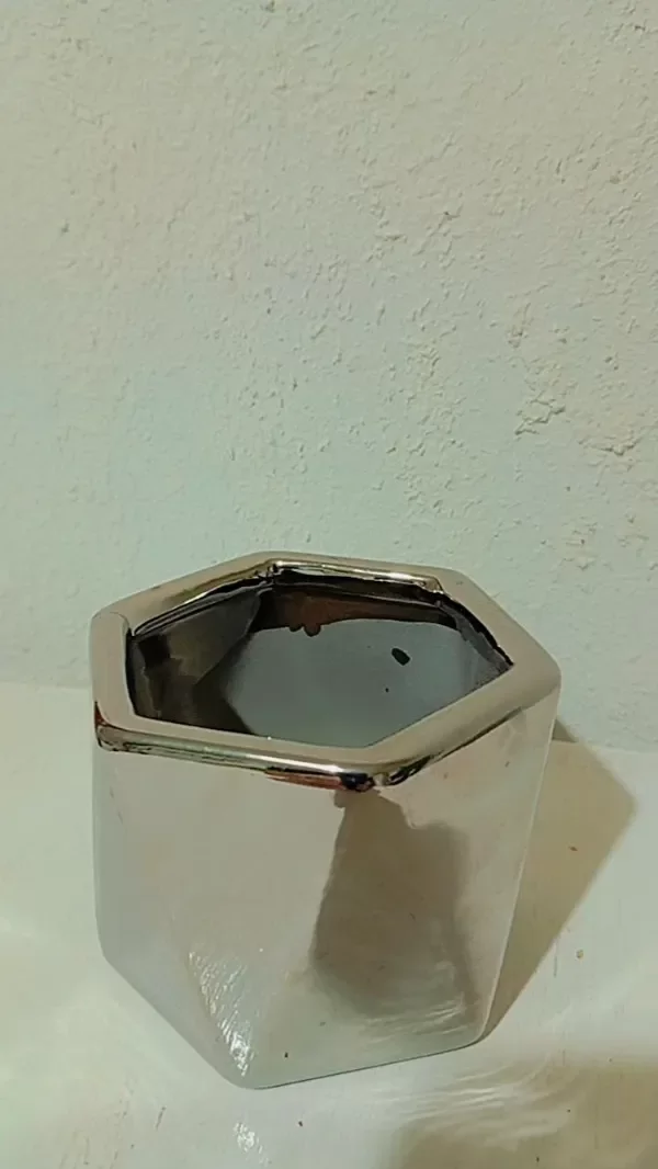 Maceta decorativa de cerámica con acabado metálico plateado.