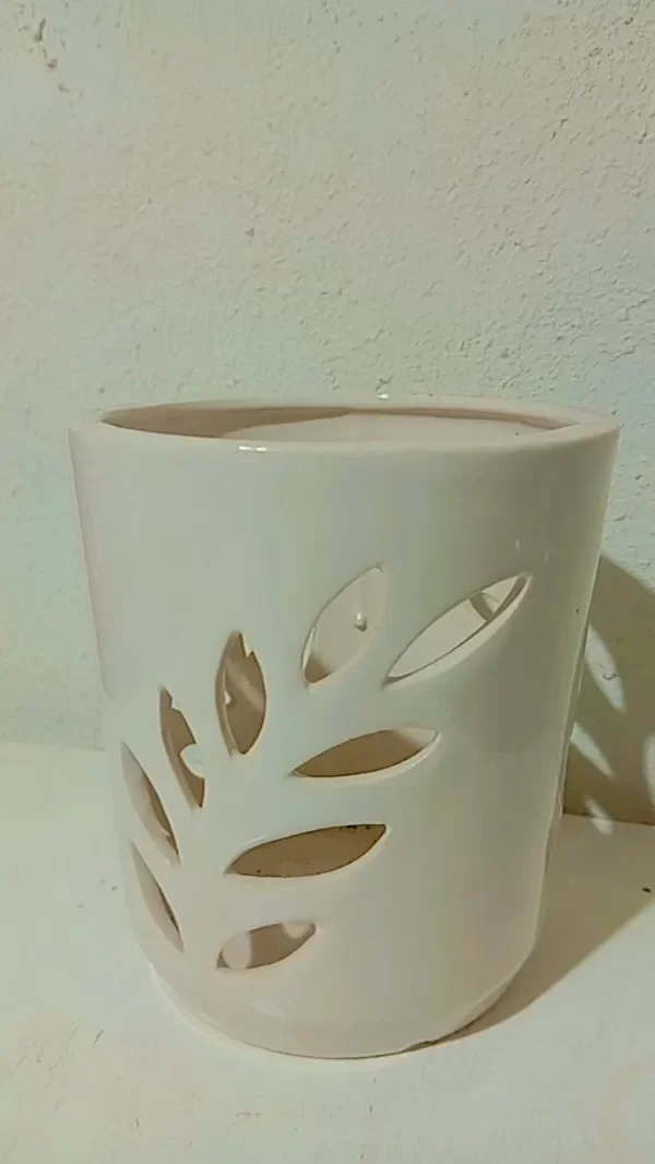 Maceta de cerámica blanca con acabado brillante, de forma cilíndrica. Su diseño destaca por los cortes calados en forma de hojas, que le dan un estilo decorativo natural y elegante.